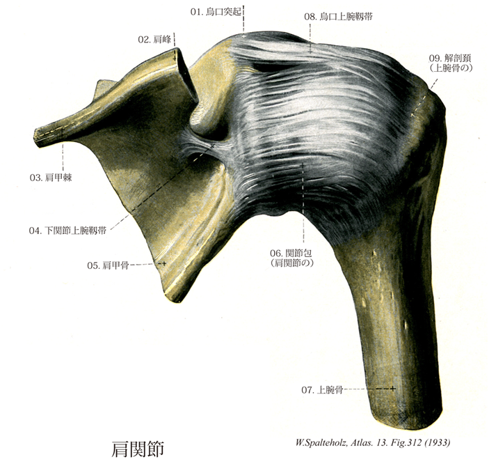 →(肩関節は肩甲骨関節窩と上腕骨頭との間の典型的な球関節。関節窩は小さく、関節頭としての上腕骨頭の関節面の約1/3の広さにすぎない。関節窩の周縁は、線維軟骨性の関節唇によって補われる。関節包の外側にはこれを補強するとくに強い靱帯がないから、両者の結合はゆるく、関節の自由な運動を可能にする。補強靱帯の代わりをするのは、肩甲骨から起始して上腕骨近位部に停止する肩甲筋群である。関節包は、上方には関節窩の周縁につき、ここで関節唇の外側と癒着し、下方には上腕骨の解剖頚につく。また内側は関節の下方でゆるみがあるから、これが上肢の回転を可能にするが、同時に下方への脱臼をおこしやすい原因となる。関節腔内は上腕二頭筋長頭の腱によって貫かれる。この腱は下方から上腕骨の結節間溝を通って関節腔に入り、上腕骨頭の前面を通って肩甲骨の関節上結節につく。全身の関節のうち最も大きい運動範囲をもち、その運動は屈曲(前方挙上)、伸展(後方挙上)、内転、外転、描円および回旋に分析鎖される。これらの運動は上肢帯の関節(胸鎖関節と肩鎖関節)との共同運動により範囲が増大される。肩甲骨関節窩は、前頭面(左右方向)に向いているのではなく、これより前外方に約30°の角をなす面にあるから(この面を肩甲骨面という)、肩関節の運動もこの面において最も運動範囲が広い。日常、物を書くときや、箸を取るときの上腕骨の位置にもこの面にある。これに属する靱帯として次のものがある。関節上腕靱帯は、関節唇の上前縁よりおこり解剖頚へつく。烏口上腕靱帯は、烏口突起の外側面よりおこり、上腕骨結節間溝の近位端にのび、ここで上腕二頭筋長頭の腱をおおう。 )