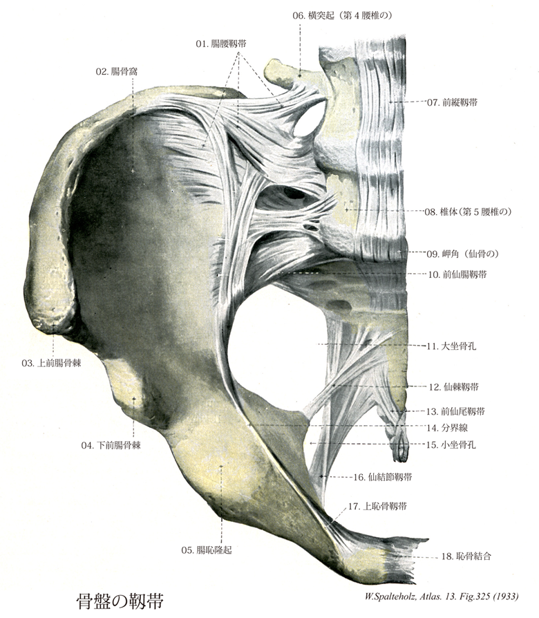 →(仙棘靱帯は坐骨棘から起こり、仙結節靱帯の前面でこれと交叉して内後方に進み、やや拡がって仙骨下部および尾骨の側縁につく。骨盤の後外側の、仙骨と寛骨の間に出来る大きな仙坐切痕は、後下方から仙結節靱帯によって閉ざされて上下に長い孔となり、これは仙棘靱帯によって上方の大坐骨切痕を含む大坐骨孔と、下方の小坐骨切痕を含む小坐骨孔とに分かれる。)