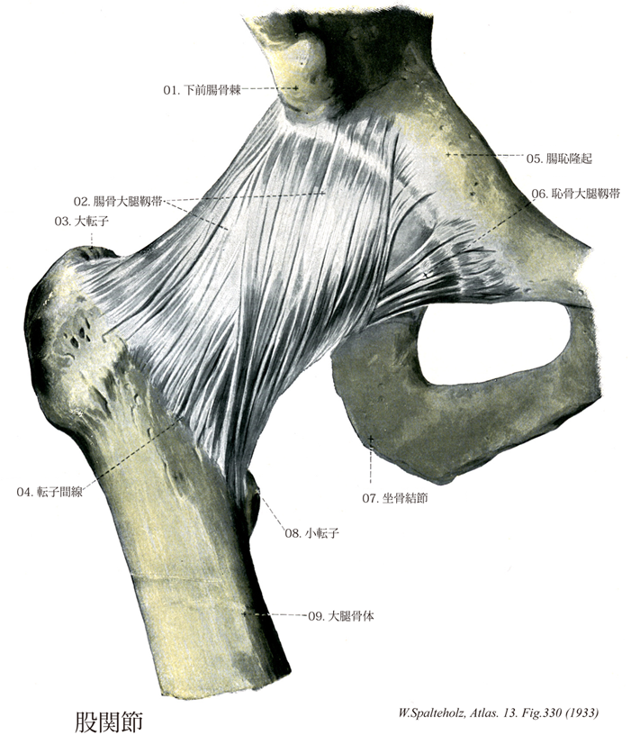 →(腸骨大腿靱帯は下前腸骨棘および寛骨臼上縁から起こり、拡がって転子間線に至る三角形の強い靱帯で、関節包の前面と上面を補強する。しかし転子間線に近い中央部はやや弱いので、強い線維束となる部は逆Y字形となる。特にその外上部は、上方では下前腸骨棘に着く大腿直筋腱の線維、下方では大転子に着く小臀筋腱の線維が表面から加わり、股関節包靱帯のなかでも最大の部分となる。腸骨大腿靱帯は靱帯最大の靱帯で、上半身が股関節より後へ傾くのを防ぐバンドの役目をしている。つまり直立のバランスをとるためには、腸腰筋と共に不可欠のものである。なお上半身が股関節で前へ傾くのを防ぐものとしては、大腿筋が最も重要である。腸骨大腿靱帯の三角筋は両側辺が厚くて中央部が薄いので、英仏ではV字靱帯、またはY字靱帯Y-shaped ligamentと呼んでいる。)
