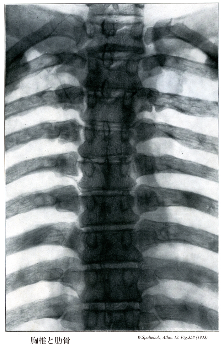 →(胸椎は頚椎につづく12個の椎骨で、肋骨と結合して胸郭を形成する。椎体は下位のほど大きい。また、椎体の高さは頚椎より高く、腰椎より低い。椎体の外側面後部には肋骨頭に対する関節窩、すなわち、肋骨窩があり、第二~第九胸椎では椎体の上縁と下縁にそれぞれ半円形の上肋骨窩、下肋骨窩がある。第一~第九胸椎では互いに隣り合う胸椎の下および上肋骨窩が1個の関節窩を作り、一個の肋骨頭と関節する。第一胸椎には半円形の下肋骨窩があり、第十胸椎では上関節窩だけが存在する。また、第十一境地では椎体の上縁に、第十二胸椎では椎体のほぼ中央に1個の円形の肋骨窩がある。胸椎の椎孔はほぼ円形をしており、頚椎の椎孔に比してかなり小さい。横突起は第八胸椎でもっとも大きく、これより上位または下位の胸椎では、第八肋骨から遠ざかるほど小さくなる。第一~第十胸椎では横突起の尖端の前面に円形の関節面があり、横突肋骨窩という。第十一および第十二胸椎の横突起には横突肋骨窩はみられない。境地の棘突起は三角柱のような形をしていて、第1胸椎から第八胸椎までは下位になるほど傾斜が強くなる。しかし、その後は次第に傾斜が弱まり、第十二胸椎ではほとんど水平である。)