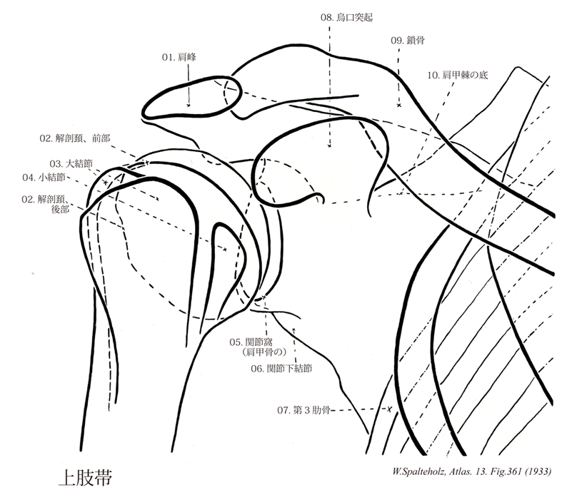 361_00【Pectoral girdle; Shoulder girdle上肢帯;胸帯;肩帯 Cingulum pectorale; Cingulum membri superioris】 Its skeletal framework consists of the scapulae and the clavicles. →(上肢帯とは肩(肩甲部)に相当し、体幹と上腕とを結合する役目をする(骨では鎖骨と肩甲骨が上肢帯骨である)。上腕と体幹との移行部で肩関節を包んでいる範囲を肩というが、その広がりははっきり規定されていない。)