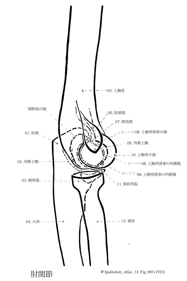 369_05【Humerus上腕骨 Humerus】 The bone of the upper arm. →(上腕骨は典型的な長管状骨であるが、上端は半球状にふくらんで上内側を向き、下端は前後に扁平である。上端の半球状の部分は大きな関節面で上腕骨頭といい、その基部の周囲にある浅いくびれを解剖頚という。上腕骨頭の前外側には2個の隆起があり、口蓋側のものを大結節、前内側のものを小結節という。両結節の下部はともに下方へ細長く延び出して、それぞれ大結節稜および小結節稜を作っている。大小の結節および結節稜の間には上下に走る溝があり、結節間溝という。大小稜結節のすぐ下で、上腕骨体に移行する部位は骨折を起こしやすく外科頚とよばれる。上腕骨体は上腕骨の大部分を占める骨幹の部分で、上半は円柱状、下半は三角柱状であり、下端は前後に扁平である。上腕骨体の外側面には、第毛節稜のすぐ下からはじまり、上腕骨体の中央に達する三角筋粗面がある。この粗面の後下方には橈骨神経溝という浅い溝があり、上腕骨体の後面を状内側から下外側に向かってラセン状に走っている。上腕骨の下端部は著しく扁平に広がり、内側方に内側上顆、外側方に外側上顆が突き出しており、内側上顆の後面には尺骨神経溝がある。この二つの上顆の間には前腕の骨と連結する上腕骨窩があり、内側の上腕骨滑車と外側の上腕骨小頭に区別される。前者は中央が浅くくぼんだ円柱状で尺骨の滑車切痕と関節をつくり、後者は小半球状で橈骨頭窩に面している。上腕骨下端部前面には二つのくぼみがあり、滑車の上方にあるものを鈎突窩、小頭の上方にあるものを橈骨窩という。これは肘を強くまげたときに尺骨の鈎状突起および橈骨頭がはまりこむところである。また、後面には滑車のすぐ上方に楕円形の深いくぼみがあり肘頭窩という。これは肘をまっすぐに伸ばしたときに尺骨の肘頭がはまりこむ場所である。鈎突窩と肘頭窩はうすい骨質をはさんで前後面から互いに相接しているが、このうすい骨質に孔があいていることがあり、これを滑車上孔という。内側上顆の上方にはまれに小さい突起がみられることがあり、これを顆上突起という。顆上突起と内側上顆の間には靱帯が張り、その間を正中神経が通過する。また、この靱帯からは円回内筋の一部がおこる。)