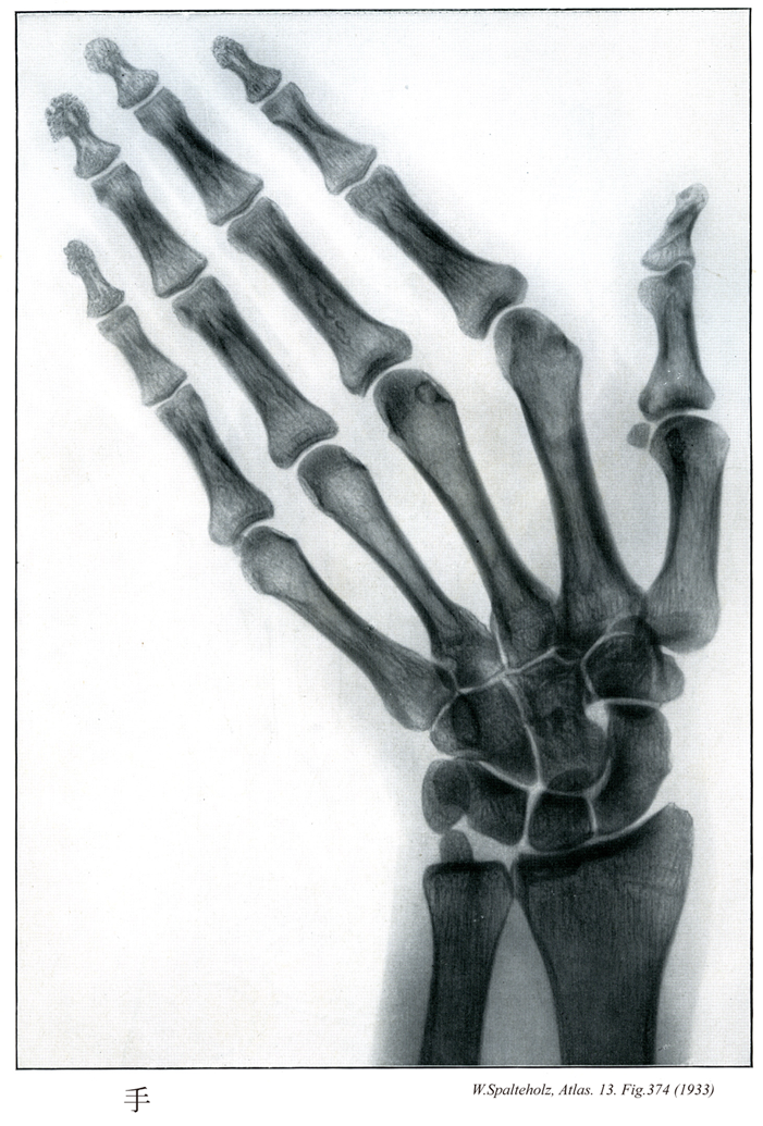 →(手は上肢のうち橈骨手根関節より遠位の部分。手根と中手に区別され、手根と中手の前面を手掌、後面を手背という。皮膚節において第六頚神経、第七頚神経、第八頚神経のレベル。)