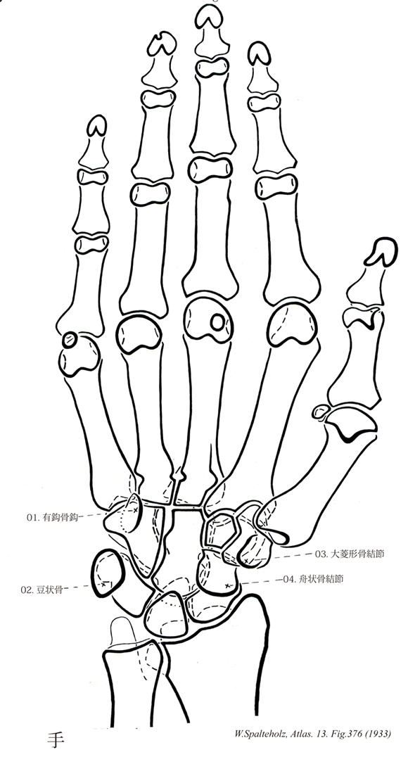 →(手は上肢のうち橈骨手根関節より遠位の部分。手根と中手に区別され、手根と中手の前面を手掌、後面を手背という。皮膚節において第六頚神経、第七頚神経、第八頚神経のレベル。)