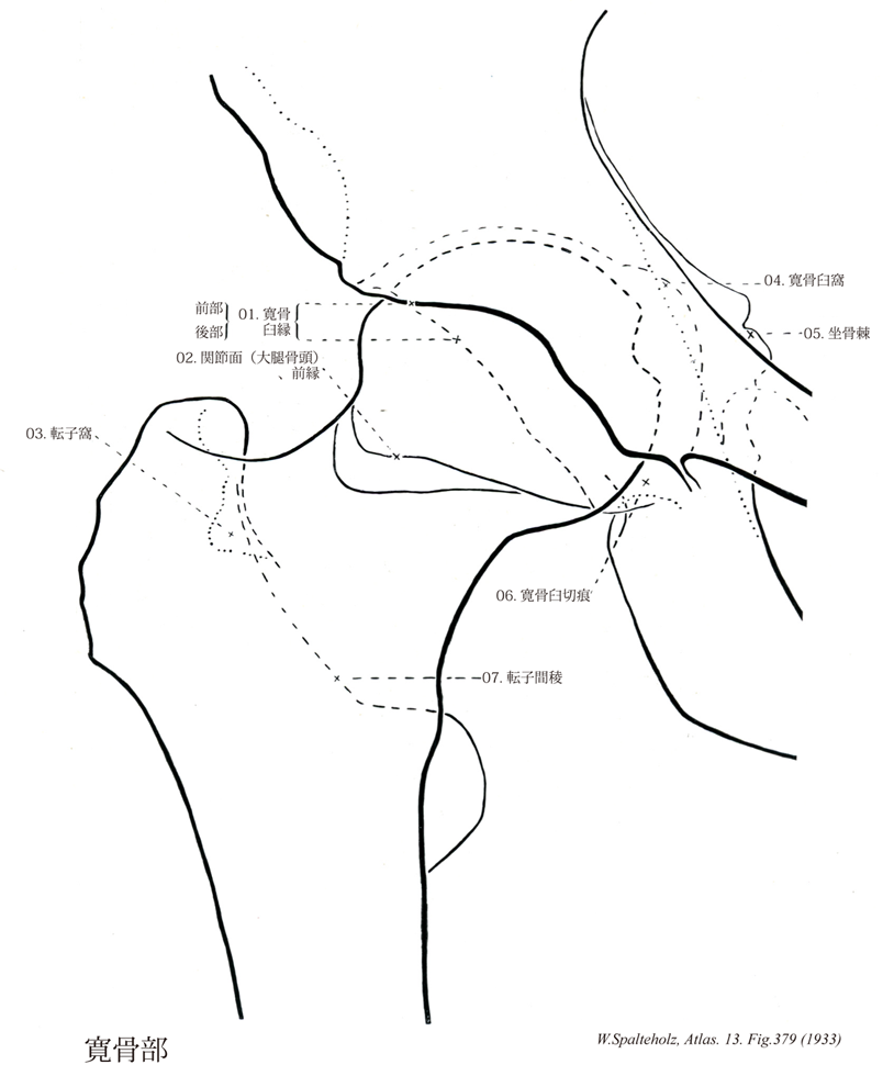 379_00【Hip寛骨部;股関節部 Coxa】 Region of articulation between the pelvis and the free lower limbs. →(腰から大腿へかけての骨盤部外側の隆起、大腿骨の骨頭、頚部と大・小転子をさす。また股関節を含めた身体の部分、同じくおおまかに股関節を指しても使われる。)