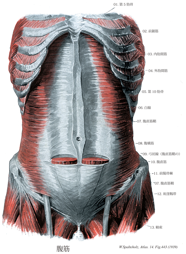 →(白線は前腹壁の中央の全長にわたっ縦に走る線維帯。腹直筋鞘の前・後葉をつくる両側の側副筋腱膜の線維が前腹壁の正中線で左右交じり合って作るつよい結合組織の紐で、上方は剣状突起前面から始まり、下ほど広くなり、臍の高さを過ぎると再び狭くなって恥骨結合上縁に至る。腹斜筋と腹横筋が付着する。)