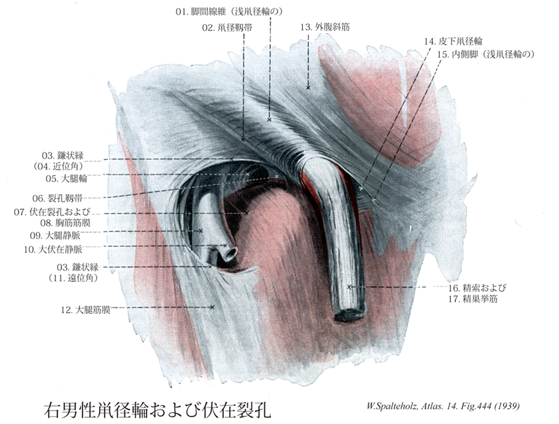 - 444_07【Saphenous opening伏在裂孔;卵円窩 Hiatus saphenus; Fossa ovalis】 Large aperture in the fascia lata just below the inguinal ligament for the passage of the great saphenous vein.