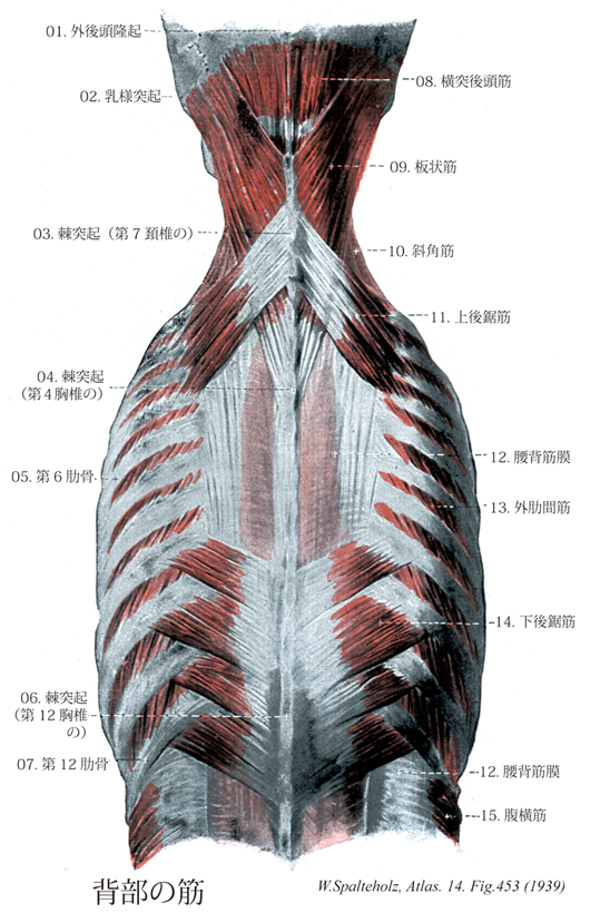 →(上後鋸筋は薄いが、強い腱膜で第6、第7頚椎と第1、第2腰椎の棘突起から起始する。この筋は下方に斜走し、4筋腹でもって第1~第4肋骨角の外側(腸肋筋停止部の外側)に停止する。この筋は肋骨挙上のための適切な挺の役目をし、吸気に協力する。)