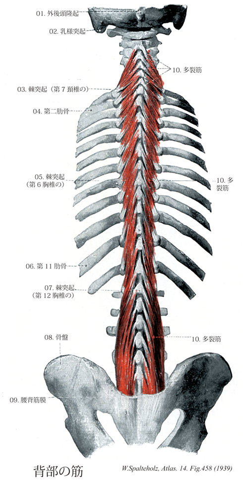 458_10【Multifidus muscle多裂筋 Musculi multifidi】 Muscles passing in transversospinal fashion from the sacrum to the second cervical vertebra. Strong muscle fibers in the lumbar region. I: Posterior rami of spinal nerves of S4-C3. →(回旋筋の表層に位置し、横突棘筋系である多裂筋は腰部でよく発達する。多裂筋の起始は仙骨背面、後仙腸靱帯、腰椎の乳様突起、胸椎の横突起、下位4個の頚椎関節突起からおこり、停止は起始である脊椎より1個上の頚椎の棘突起につく。機能として脊柱の伸展、側方屈曲、回旋の補助。骨盤の伸展と側方移動。神経支配は前脊髄神経の後枝。動脈は後肋間動脈と腰動脈の内側枝。肋頚動脈の深頚枝から受ける。さまざまな方向に羽状化した筋束のうち、深部のものは起始と停止が2椎骨を越え、浅部のものは3~5つ骨を越える。筋走行は胸椎の棘突起または仙骨、腰椎、頚椎の相同部付近から起こり、上位椎骨の棘突起へ斜め上内側法へ走る。深層の筋束は2個の椎骨を飛び越える。浅層の筋束は3-5個を飛び越える。起始域は第4仙椎から第4(5)頚椎に、停止域は第5腰椎から第2頚椎である。)