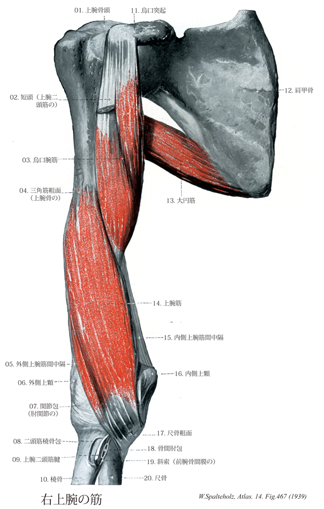 - 467_02【Short head of biceps brachii muscle短頭(上腕二頭筋の) Caput breve (Musculus biceps brachii)】 o: Coracoid process. Adduction of shoulder joint.