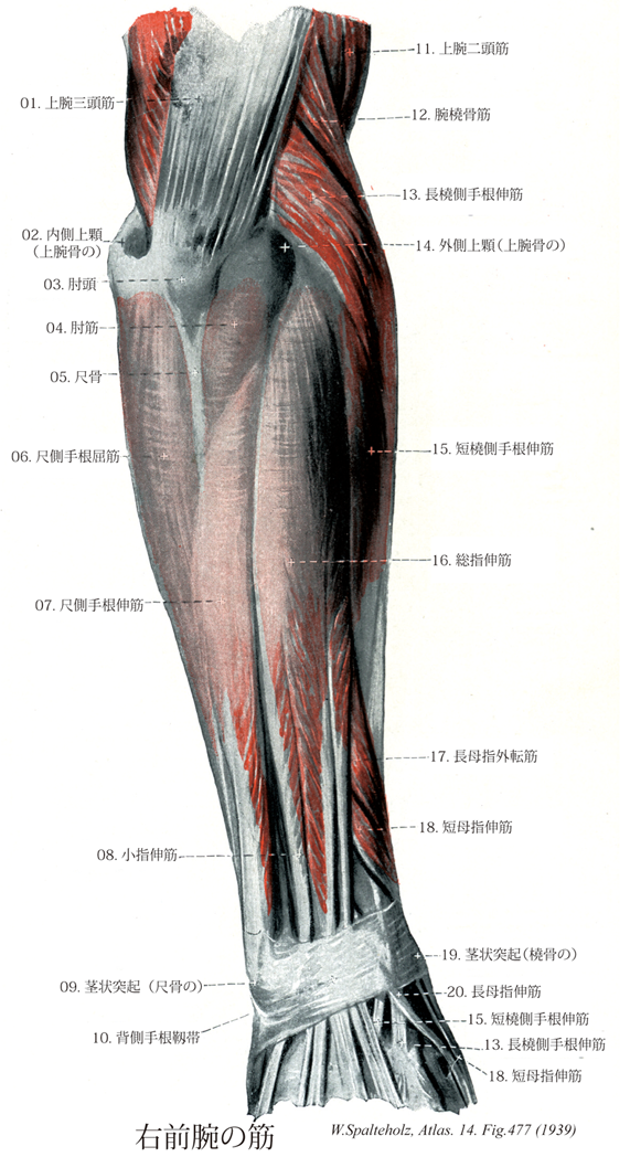 - 477_15【Extensor carpi radialis brevis muscle短橈側手根伸筋 Musculus extensor carpi radialis brevis】 o: Lateral epicondyle of humerus, anular ligament of radius, i: Base of third metacarpal. Dorsiflexion of the hand.