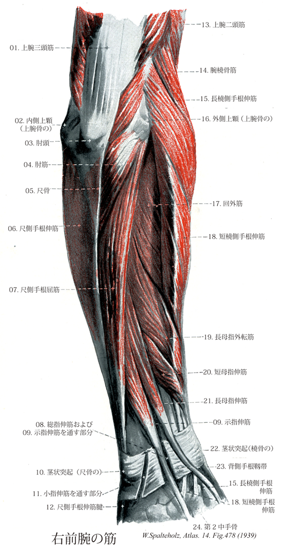 →(回外筋は上腕骨の外側上顆、肘関節の外側腱索と尺骨の回外筋稜から起こる。薄い筋板は橈骨の外側を回り、後面から、橈骨粗面と円回内筋の停止部との間の橈骨の前面に付く。橈骨神経深枝はこの筋の近位辺縁近くで筋に入り、ラセン状の“回外筋管”を通って筋の遠位に抜ける。)