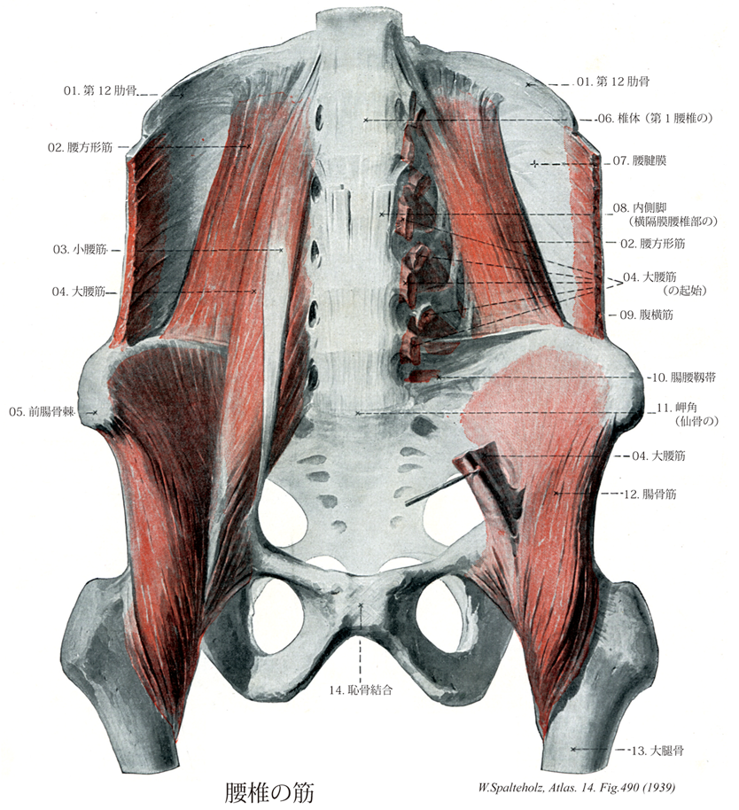 →(大腰筋の前面には、小腰筋が40~50%の頻度で存在する。この細長い筋は、上位腰椎の椎体から起こり、その腱は腸骨筋の表面の筋膜(腸骨筋間)に放散しながら恥骨櫛に終わる(すなわち小腰筋は骨盤の外には出ない)。第3の寛骨内筋、その起始は第12胸椎と第1腰椎である。長い腱は大腰筋上を尾側へ向かい、腸腰筋膜や、特に腸恥骨弓に放散する。小腰筋は約半例で欠損する。人種差は認められないが、概して女性に欠ける率が多い。また小腰筋は重複することがある。)