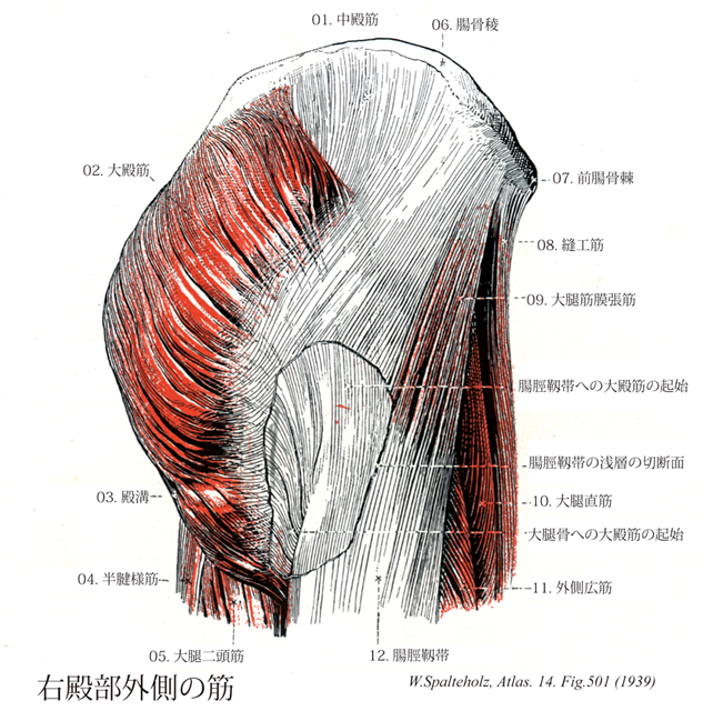 →(大臀筋は大腿を伸展する主力筋で、とくに歩行の際重要である。中臀筋や小臀筋(小さな臀部の筋群)と同様、大きな臀部の筋である大臀筋も発生的には伸筋群である。仙骨と尾骨の辺縁、後臀筋線より後方の腸骨稜、胸腰筋膜、そして仙結節靭帯などから起始する。その厚い筋線維束は斜め下方へ走り、広い停止腱となる。その停止域は近位では大腿筋膜、腸脛靱帯に放散する。また、臀筋粗面よりも遠位で外側筋間中隔より上の粗線外側唇にも停止する。坐骨包坐骨結節と大臀筋下面の筋膜との間にある。慢性的刺激の結果として(機織工結節、抗夫結節)、臀部に敷物なしに座り仕事をする人々では同包に炎症が起こり、後大腿皮神経を圧迫する。大腿筋の停止腱は転子包によって大転子と離される。臀筋粗面では、大腿筋はふつう他の臀筋との間にあるいくつかの筋間包の上を滑走する。立位では大臀筋下部が坐骨結節をおおう。大腿を屈すると大臀筋下部は頭側に移動する。このため座位では坐骨結節は皮下脂肪上に位置し、皮膚を通して容易に触れる。臀溝はほぼ水平に走り、大臀筋収縮時には深くなるが、大臀筋の下縁をあらわしているわけではなく、同筋走行に対して鋭角的に交わる。)