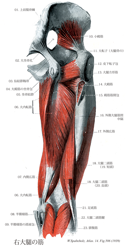 - 506_20【Long head of biceps femoris muscle長頭(大腿二頭筋の) Caput longum (Musculus biceps femoris)】 o: Ischial tuberosity. Extension at the hip joint. I: Tibial nerve.