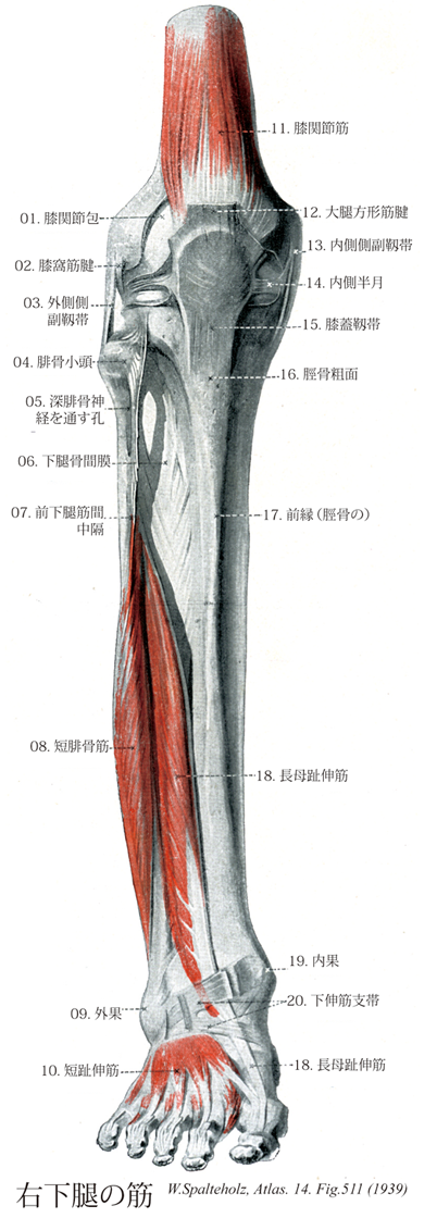 511_18【Extensor hallucis longus muscle長母趾伸筋;長母指伸筋(足の) Musculus extensor hallucis longus】 o: Interosseous membrane and fibula, i: Distal phalanx of great toe. Dorsiflexion of foot and great toe. I: Deep fibular nerve. →(長母趾伸筋は腓骨内側面と骨間膜(中間2/4,3/4の部)の起始部では隣り合う2つの筋によって完全におおわれている。長母趾伸筋の腱は上伸筋支帯の直下で浅層を走り末節骨に着く。また、一部は足背筋膜をもたない母趾基節骨にも付く。長母趾伸筋の腱鞘は内果のレベルでようやく始まるが、ずっと遠位へ伸び、第1中足骨底あるいは頭まで至る。)