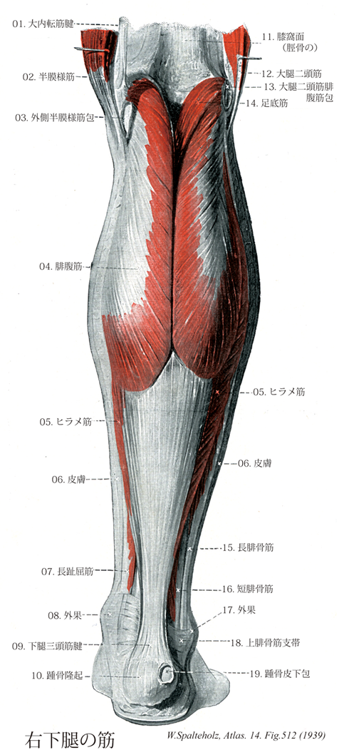 →(ヒラメ筋の下腿後区浅層の筋の1つ。大半は腓腹筋におおわれ、腓骨頭から腓骨後面、腱性弓(ヒラメ筋腱弓)および脛骨(ヒラメ筋線と内側縁)に起始する。ヒラメ筋腱弓は腓骨から脛骨へ至り、神経血管索をまたぐ。ヒラメ筋はアキレス腱を介して踵骨隆起に停止する。ヒラメ筋の筋腹は腓腹筋の筋腹よりも遠位に伸び、微細な腱様層によっておおわれている。その上を腓腹筋が滑走する。ヒラメ筋は複合羽状筋で、前頭平面に位置する腱様膜によって浅層の筋層に分けることができる。脛骨神経の支配を受ける。この筋は腓腹筋、足底筋とともに距腿関節における足の底屈を生じさせる。すなわち、これらの3筋は歩行、歩行時に、地面を後方に蹴るための力を出すのである。)