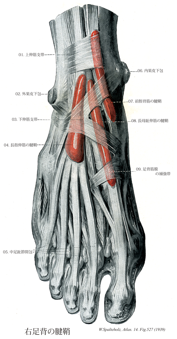 →(足の下伸筋支帯は足背筋膜の近位部が厚くなったもので、踵骨外側面の前上部から起こって内果と内側楔状骨に向かうY字形をなす。下伸筋支帯の外側脚は最も強く、第3脛骨筋、長趾伸筋の腱および短趾伸筋の浅深両面を包む。これをワナ靱帯(INA)ともいう。上内側脚はやや弱く、長母趾伸筋の浅面と前脛骨筋の唇面を通り内果につくが、さらに弱い層がこの2腱の他の面を包む。下内側脚は最も弱く長母趾伸筋の浅面を被う、そのほか下内側脚のさらに前方長・短母趾伸筋を被うものがある(母趾伸筋支帯)。またまた外側脚のほかに上外側脚があるときは、外果から起こり、全体として十字状となる。)