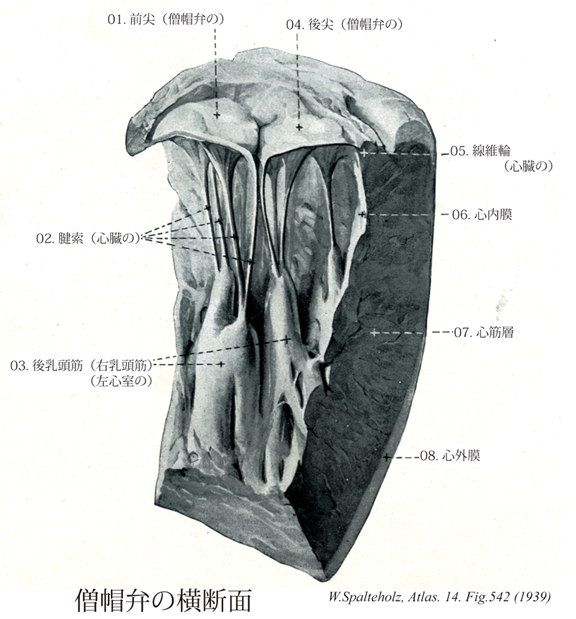 542_01【Anterior cusp of mitral valve; Anterior cusp of left atrioventricular valve; Anterior cusp of bicuspid valve前尖(僧帽弁の;左房室弁の) Cuspis anterior (Valva mitralis)】 Anterior leaflet situated near the septum. →(僧帽弁の前尖は前方で、心室中隔側にある。)