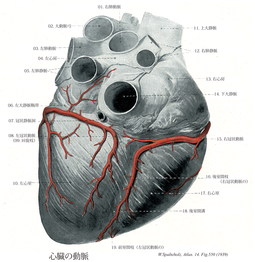 →(左冠状動脈は右心耳と肺動脈との間から前面に現れて、前室間溝を大心臓静脈の主脈と共に下降する(前室間枝)。これから分かれるかなり大きい枝が冠状溝に沿って後面へ回り(回旋枝)、右冠状動脈の枝と吻合する。この回旋枝からは、左辺縁枝が下方に出る。)