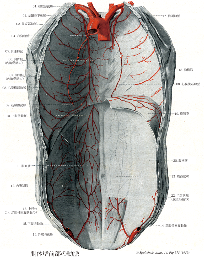 →(内胸動脈は胸骨縁に沿い前胸壁内面を下行し、横隔膜前端を貫いて上腹壁動脈に移行し、腹直筋内で下腹壁動脈と吻合して、前正中線に沿う縦走動脈路を形成する。異常の経過からして縦隔と前胸壁に分布するのに適している。縦隔への枝としては、縦隔枝、胸腺枝、気管支枝さらに横隔神経に伴走する心膜横隔動脈がある。前胸壁への枝としては、胸骨枝、肋間隙を外側に走り肋間動脈と吻合する前肋間枝、肋間隙を貫き乳腺枝を分岐しうる貫通枝、ならびに横隔膜と胸壁下部に分布する筋横隔動脈などがある。なお側胸壁内面を下行する外側肋骨枝がまれに内胸動脈初部からおこることがある。)