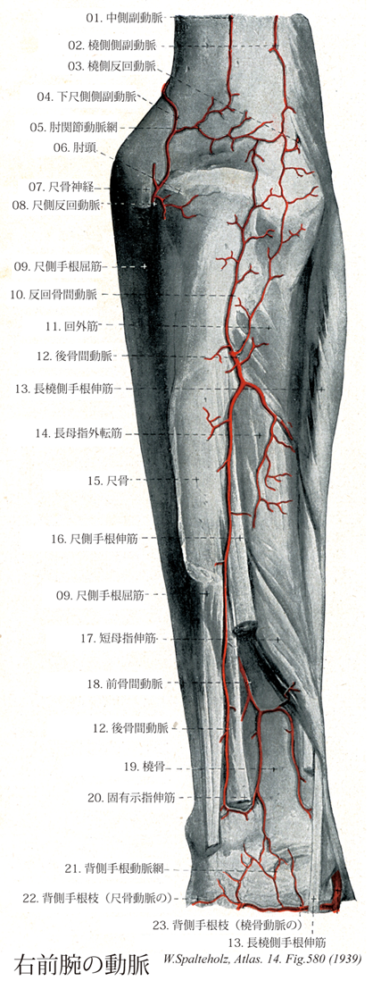 →(肘関節動脈網は肘関節包の前面・後面に分布する枝によってつくられる動脈網で、ことに関節後面でよく発達している。これに関与する動脈は、主として上腕骨の内側および外側上顆の前面と後面を経て分布するがこれには上腕動脈の枝(上および下尺側側副動脈、中側副動脈、橈側側副動脈)、尺骨動脈の枝(尺側反回動脈の前枝および後枝、反回骨間動脈)、橈骨動脈の枝(橈側反回動脈)などがある。)