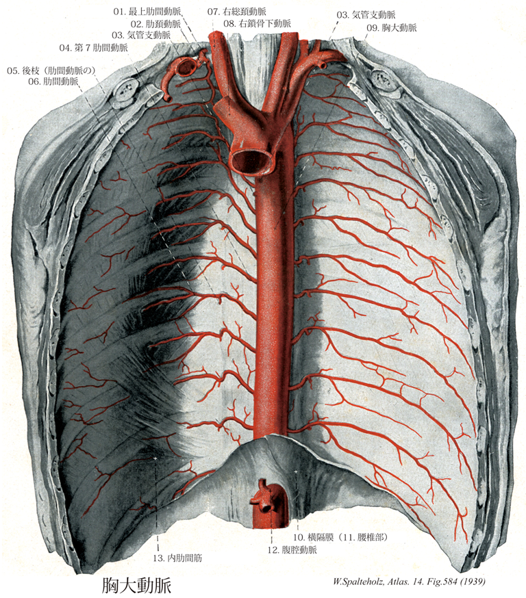 - 584_06【Posterior intercostal arteries; Intercostal arteries肋間動脈;後肋間動脈(第3~第11) Arteriae intercostales posteriores】 Paired tributaries arising from the posterior wall of the aorta, supplying the third through eleventh intercostal spaces.