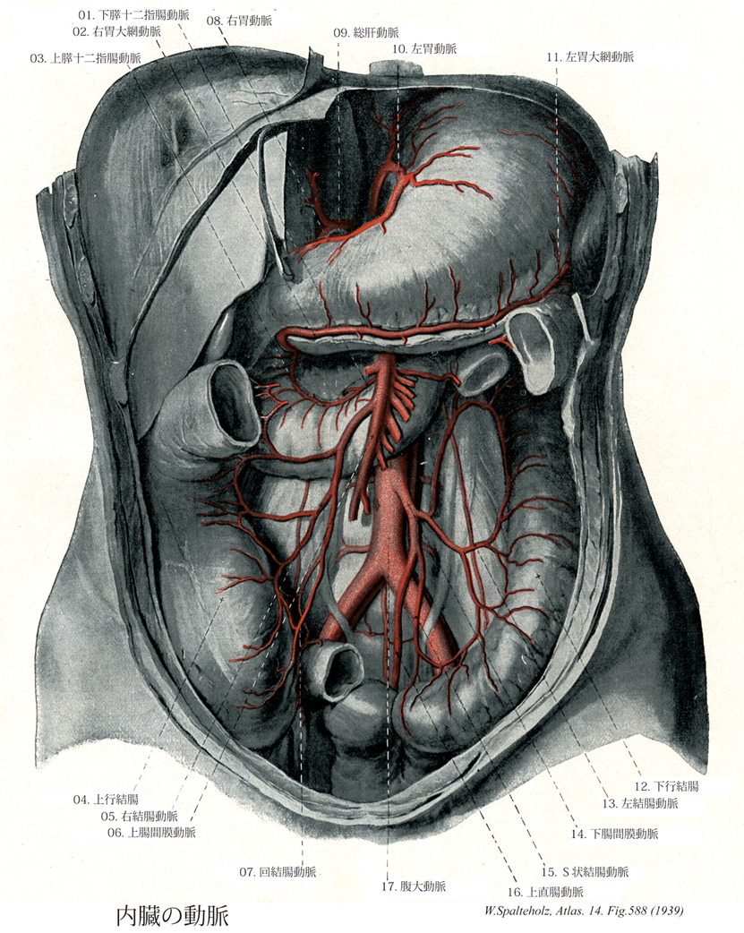 →(上腸間膜動脈は腹腔動脈の約1~2cm下方(第1腰椎の高さ)で、腹大動脈の前側から起こる。動脈ははじめ膵臓の後ろを走り、膵臓の頭の左側に沿って前方に出て、十二指腸水平部の前面を下行し、小腸間膜のなかに入る。小腸間膜内で、左方にやや凸のカーブを描いて右腸骨窩に向かって下行し、下膵十二指腸動脈、空腸動脈、腸骨動脈、回結腸動脈、虫垂動脈、右結腸動脈、中結腸動脈に分布する。上膵十二指腸動脈、左結腸動脈と吻合する。)