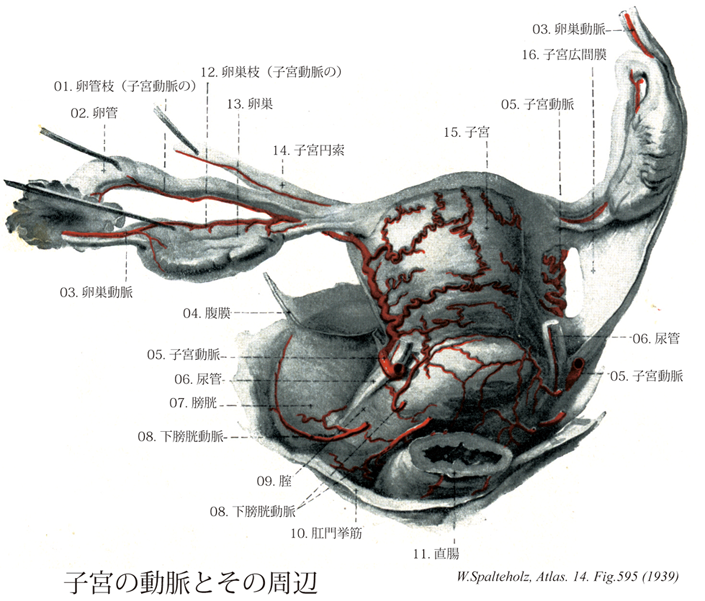 →(子宮動脈は内腸骨動脈より起こり、子宮、腟上部、子宮円索、卵管の内側部に分布する。卵巣動脈、腟動脈、下腹壁動脈と吻合する。妊娠時には胎盤への母胎循環血を供給する。)