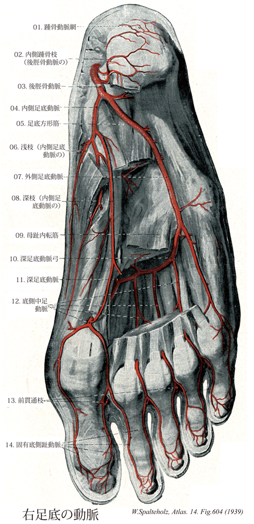 604_14【Plantar digital arteries proper; Proper plantar digital arteries固有底側趾動脈;固有底側指動脈(足の) Arteriae digitales plantares propriae】 Arteries running along the medial and lateral plantar aspects of the toes. →(固有底側趾動脈は各底側中足動脈が二分して、それぞれ隣接する指の対向縁を前進する。)