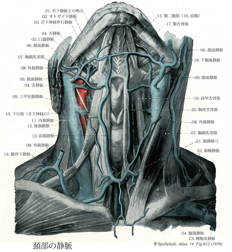 →(上甲状腺静脈は甲状腺上部におこり上甲状腺動脈に伴行する。上喉頭静脈ならびに胸鎖乳突筋静脈を受け入れる。胸鎖乳突筋静脈は内頚静脈に直接そそぐこともある。またしばしば甲状腺下部におこる中甲状腺静脈がみられる。)
