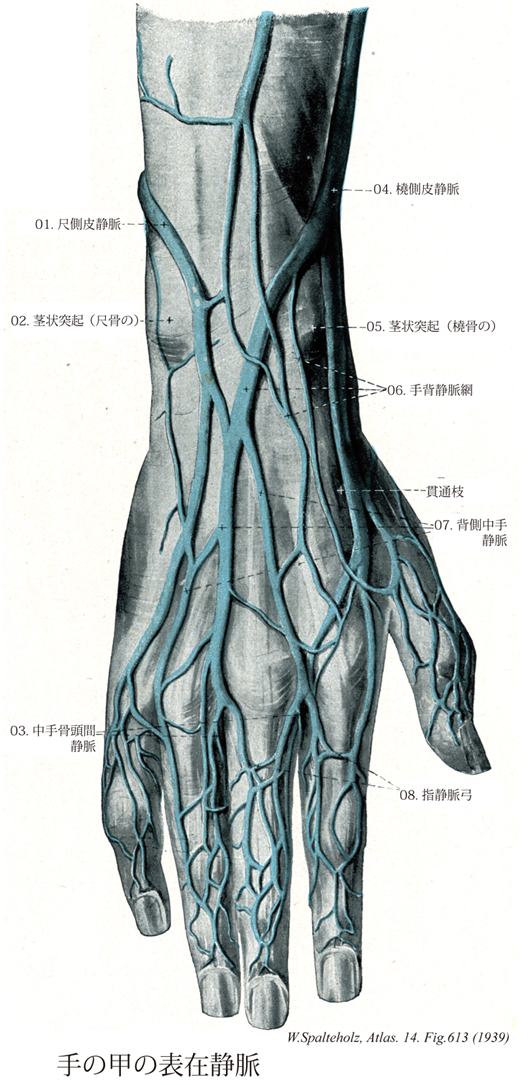 →(手背静脈網は手背にある静脈網で、第2~5指の対向縁よりの3本の背側中手静脈が注ぐ。この橈側部にはさらに母指と第2指の橈側縁よりの背側指静脈がそそぎ、これから前腕に向かって橈側皮静脈を出す。手背静脈網の尺側部には、小指の尺側縁よりの背側指静脈も加わり、これから尺側皮静脈が出る。)