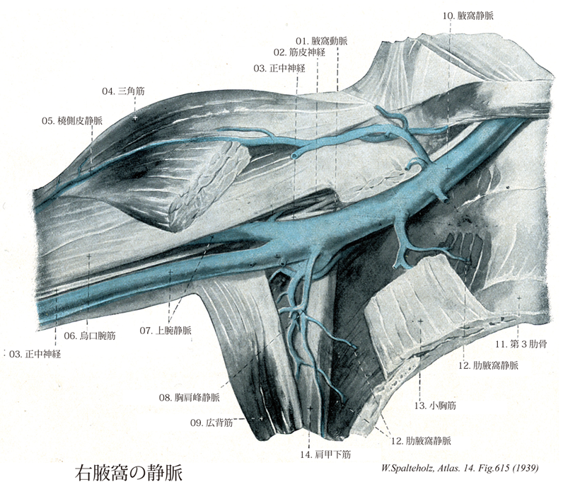 - 615_05【Cephalic vein橈側皮静脈 Vena cephalica】 Epifascial vein arising at the root of the thumb. It courses in the lateral bicipital groove and passes between the deltoid and pectoralis major (deltopectoral triangle; Mohrenheim's fossa) to the axillary vein.