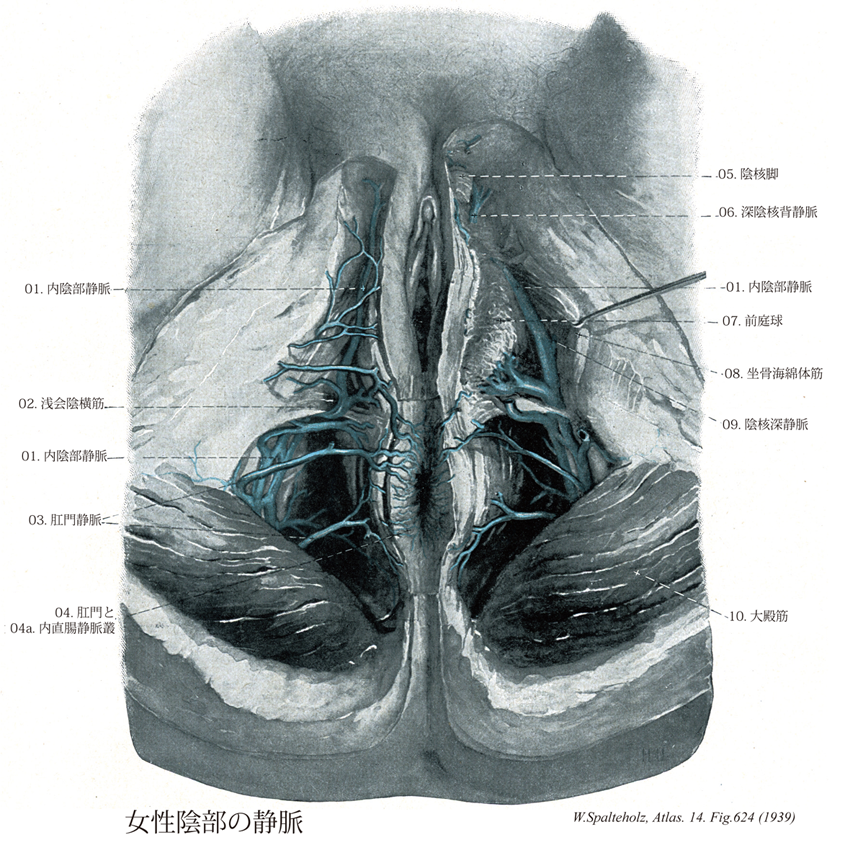 - 624_03【Inferior rectal veins下直腸静脈;肛門静脈 Venae rectales inferiores; Venae anales】 Branches from the anal region that pass to the internal pudendal vein. They anastomose with the middle rectal veins and superior rectal vein.