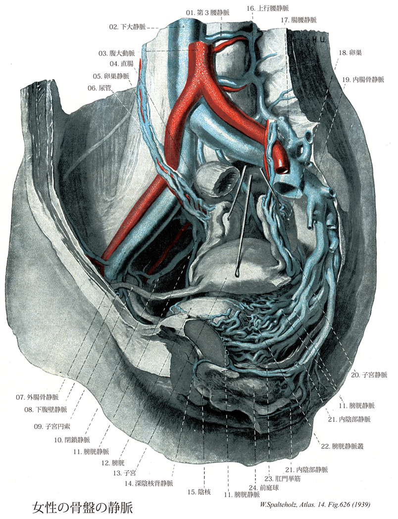 626_18【Ovary内腸骨静脈 Vena iliaca interna】 Short venous trunk that receives veins from the pelvic viscera and perineum. →(内腸骨静脈は主として骨盤内増からの血液を集める。その分枝は、内腸骨動脈の場合とほとんど同じで、それぞれ内腸骨動脈と伴行している(ただし、臍血管を除く)。本幹は骨盤腔の側壁に接して大坐骨孔で梨状筋上孔を通って骨盤腔にはいる。)