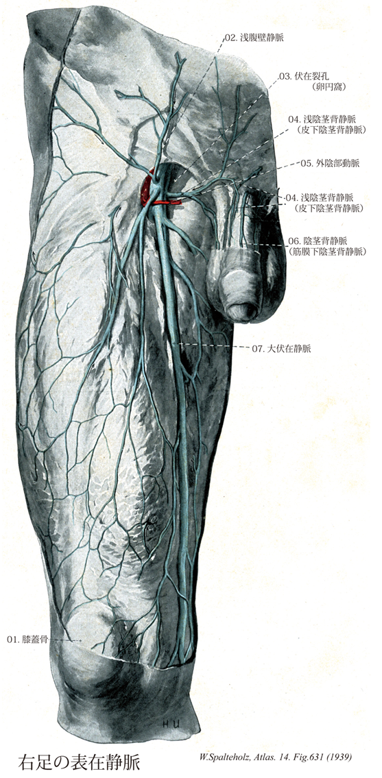 631_07【Great saphenous vein; Long saphenous vein大伏在静脈 Vena saphena magna】 Vein possessing valves that arises on the medial side of the foot and ascends medially, collecting most of the medial superficial cutaneous veins. It passes through the saphenous opening to empty into the femoral vein. →(大伏在静脈は古くは薔薇静脈とよんだこともある。ギリシャ語のsaphisは「見える」という意味であるというが、他方アラビア語では「かくれた」という意味を表すという。このように語原的にはギリシャ語とアラビア語では反対の意味に解されているのは興味深いが、いずれにしてもVena saphenaの語原ははっきりしていない。大伏在静脈は下肢最大の皮静脈で、下肢の内側に沿って皮下組織の中を上行する。足背の内側縁にはじまり、内果の前を通るが、この部分で皮膚のうえからその走行をみることができる。伏在神経と伴行して下腿の内側を通り、膝関節の後内側を経て大腿内側面を上行し、鼡径靱帯の下方で深く入り、伏在裂孔で大腿静脈にそそぐ。この経過の途中、周辺より多くの皮静脈がこれに合流するが、とくに大腿の内側と後面よりの皮静脈は1本に合して伏在裂孔のやや下方で大伏在静脈にそそぐことがある。これを副伏在静脈という。また大腿の前面や外側面よりの皮静脈が合しこれにそそぐときは、とくに外側伏在静脈とよぶことがある。このときは大内々側面よりのものは内側伏在静脈という。)