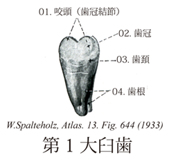 644_01【Tubercle of tooth咬頭;歯冠結節 Tuberculum dentis; Tuberculum coronae dentis】 Small protuberance of variable size on the lingual surface of the incisor and canine teeth. →(歯冠結節はとくに切歯および犬歯で、歯冠側面にあるいろいろな程度の小隆起。)