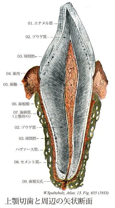 →(歯根膜とは、歯槽骨と歯根のセメント質の間に存在する骨の歯槽に固定している結合組織で、一端がセメント質に固定され他端が歯槽骨に放散する線維からなる。決して細胞膜のような膜ではない。その大部分は、膠原線維の集束したシャーピー線維が占め、他の部分は疎性結合組織(血管および神経を含む)からなる。このシャーピー線維の役目は歯を顎骨につなぎ止めることである。それゆえ、そのいったんは顎骨を形成する歯槽骨に、そして多端は歯根部のセメント質に入り込んでいる。一歩、疎性結合組織の中に含まれる神経は、主として触覚に関与しているので、そこで我々は歯に触れたことを、鋭敏に知ることができる。)