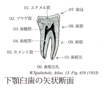 658_02【Dentineゾウゲ質;象牙質 Dentinum; Substantia eburnea】 Main component of the tooth consisting of inorganic and organic substance (predominantly collagen fibers). →(ソウゲ質は、歯髄腔をつつみ歯の主体をなす硬組織で一般に淡黄色であり、エナメル質より弾性があり、骨より多少硬いが、エナメル質より軟らかい。そして、エナメル質と異なって、その有機成分が多くなって、全体の約20~30%を占め、残りの70%が無機質である。その名の元になった長鼻類(ゾウ)の牙は動物界で最大のゾウゲ質である。有機成分は、膠原原線維と、基質であるムコ多糖類からなっている。一方、無機質は、骨、セメント質およびエナメル質同じく、ハイドロキサパタイトhydroxyapatiteからなっている。無機質および有機質(主として膠原線維)からなる歯の主要部分。歯髄側から低石灰化の前象牙質と本来の象牙質からなっており、これらの2つの象牙質を多数の細管が走行している。これらの細管は、象牙細管とといわれ、歯髄を中心にして、エナメル象牙鏡まで達しており、途中側枝を出し、隣接の細管を側枝と吻合して、さらにこれらの細管の中に、トームス線維が含まれている。このトームス線維は、線維となっているが、膠原線維のような線維ではなく、歯髄側に位置する象牙芽細胞の細胞突起そのものである。すなわち象牙芽細胞とは、その細胞体自身は歯髄におき、圧倒的に長いその細胞突起を、エナメル質まで伸ばしていることになる。)