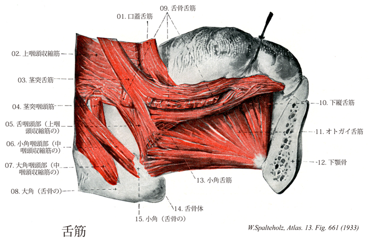 →(舌筋はすべて横紋筋であって外舌筋(オトガイ舌筋、舌骨舌筋、茎突舌筋)、内舌筋(上縦舌筋、下縦舌筋、横舌筋、垂直舌筋)があるが、その舌内にある部分はいずれも、他の筋と異なって多数の脂肪細胞を含む疎性組織により多くの小束に分かたれ、そのために下は軟らかくかつ自由に動きうる。舌筋の作用はオトガイ舌筋のおもな作用は舌を前方に突出させ、また舌の中央部を舌に引く。舌骨舌筋および茎突舌筋のおもな作用は舌を後に引き込ますが、同時に舌骨舌筋は舌の側縁を舌に引き、茎突舌筋は舌背を高める。またこの3筋が一側だけ動けば舌を外側に曲げる。上下の縦舌筋は舌を短縮させ、横舌筋は狭くすると同時に延長させる。垂直舌筋は舌を平らにする。舌筋は舌根ではやや複雑な走向ををとるが、全体としてはほぼたがいに直行する三つの系列にわけられ、それぞれ前後(上縦舌筋、下縦舌筋、茎突舌筋、舌骨舌筋など)、左右(横舌筋、口蓋舌筋、茎突舌筋の一部、上咽頭収縮筋舌咽頭部など)、上下(垂直舌筋、オトガイ舌筋、小角舌筋、舌骨舌筋の一部など)に走る。前後に縦走する系列は比較的舌の表面近くを走り、全体としては他の系列を外からかこむような傾向で配列する。)
