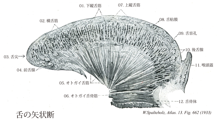 →(舌は筋がよく発達した器官で、舌の前方の大部分は舌体、舌の前端部を舌尖、舌の後部を舌根という。また舌の上面を舌背といい、その正中線に舌正中溝があり、舌体と舌根との境界にはV字形の分界溝がある。分界溝の中央には舌背孔とよばれる陥凹があり、これは胎生期に、ここから甲状腺の原基が陥入したため、甲状腺と連なっていた甲状舌管のなごりである。舌の外側縁を舌縁といい、舌の下面正中線には口腔粘膜との間に舌小帯とよばれる粘膜ヒダがあり、舌の下面で、舌根両側から舌尖に向かう軟らかい鋸状の釆状ヒダとよばれる粘膜ヒダがる。舌の表面は舌粘膜でおおわれ、その深層にある舌筋と固く結合している。舌体の粘膜は舌乳頭とよばれる乳頭が非常に発達しており、舌乳頭は糸状乳頭、円錐乳頭、茸状乳頭、葉状乳頭、有郭乳頭に区別されている。舌根には舌乳頭がなく、多数の舌小胞とよばれる小丘状の高まりがみられる。舌小胞はリンパ小節の集団によって構成されており、これらの舌小胞を総称して舌扁桃とよばれている。舌体では舌粘膜が強靭な舌腱膜とよばれる密な結合組織で粘膜下の筋と固く結合しており、舌の正中面では舌腱膜に連続して密な結合組織が中隔をなしており、これを舌中隔とよんでいる。味覚器官をもち、咀嚼、燕下、および構音を助ける。)