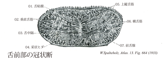→(舌は筋がよく発達した器官で、舌の前方の大部分は舌体、舌の前端部を舌尖、舌の後部を舌根という。また舌の上面を舌背といい、その正中線に舌正中溝があり、舌体と舌根との境界にはV字形の分界溝がある。分界溝の中央には舌背孔とよばれる陥凹があり、これは胎生期に、ここから甲状腺の原基が陥入したため、甲状腺と連なっていた甲状舌管のなごりである。舌の外側縁を舌縁といい、舌の下面正中線には口腔粘膜との間に舌小帯とよばれる粘膜ヒダがあり、舌の下面で、舌根両側から舌尖に向かう軟らかい鋸状の釆状ヒダとよばれる粘膜ヒダがる。舌の表面は舌粘膜でおおわれ、その深層にある舌筋と固く結合している。舌体の粘膜は舌乳頭とよばれる乳頭が非常に発達しており、舌乳頭は糸状乳頭、円錐乳頭、茸状乳頭、葉状乳頭、有郭乳頭に区別されている。舌根には舌乳頭がなく、多数の舌小胞とよばれる小丘状の高まりがみられる。舌小胞はリンパ小節の集団によって構成されており、これらの舌小胞を総称して舌扁桃とよばれている。舌体では舌粘膜が強靭な舌腱膜とよばれる密な結合組織で粘膜下の筋と固く結合しており、舌の正中面では舌腱膜に連続して密な結合組織が中隔をなしており、これを舌中隔とよんでいる。味覚器官をもち、咀嚼、燕下、および構音を助ける。)