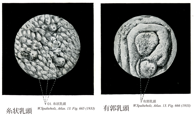 665_01【Filiform papillae糸状乳頭 Papillae filiformes】 Most common form. Epithelial projections, often split at their tips, surrounding a conical connective-tissue core. →(糸状乳頭は舌体の背面全域にわたって密在する円錐状の乳頭で、表層の上皮は角化し、生体では白くみえる。糸状乳頭によって舌背の表面はややザラザラとなり、食物の移動に役立つと考えられる。これはヒトではあまり典型的ではないが、他の哺乳類、例えばネコ等では、糸状乳頭の整然たる発達が認められ、これが食物摂取を容易にしており、それゆえ糸状乳頭の機能的特徴の一つとしてあげられる。さらに、乳頭内に多くの神経がきていることからして、一種の感覚装置とも考えられている。さらに、糸状乳頭の外観は細長い指状を呈し、他の口腔組織がそうであるように、糸状乳頭も重層扁平上皮から成り立っていて、その最表層は、角化しているのが、他の舌乳頭との大きな違いであり、糸状乳頭の組織学的な特徴となっている。)