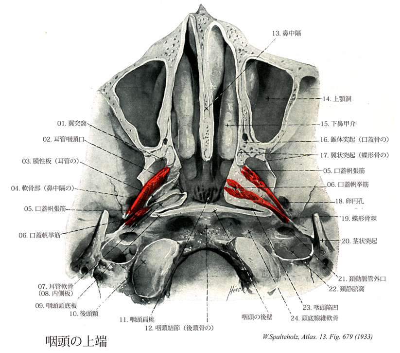 →(口蓋帆張筋は舟状窩、蝶形骨大翼下面の細い帯および耳管の膜性外壁から起始する。翼突窩のレベルで口蓋帆張筋はすでに腱に移行し、腱は翼突鈎をめぐって方向を転じて、水平に口蓋腱膜へ放射する。口蓋帆張筋は燕下swallowing or deglutionの時に耳管を開く作用がある。)