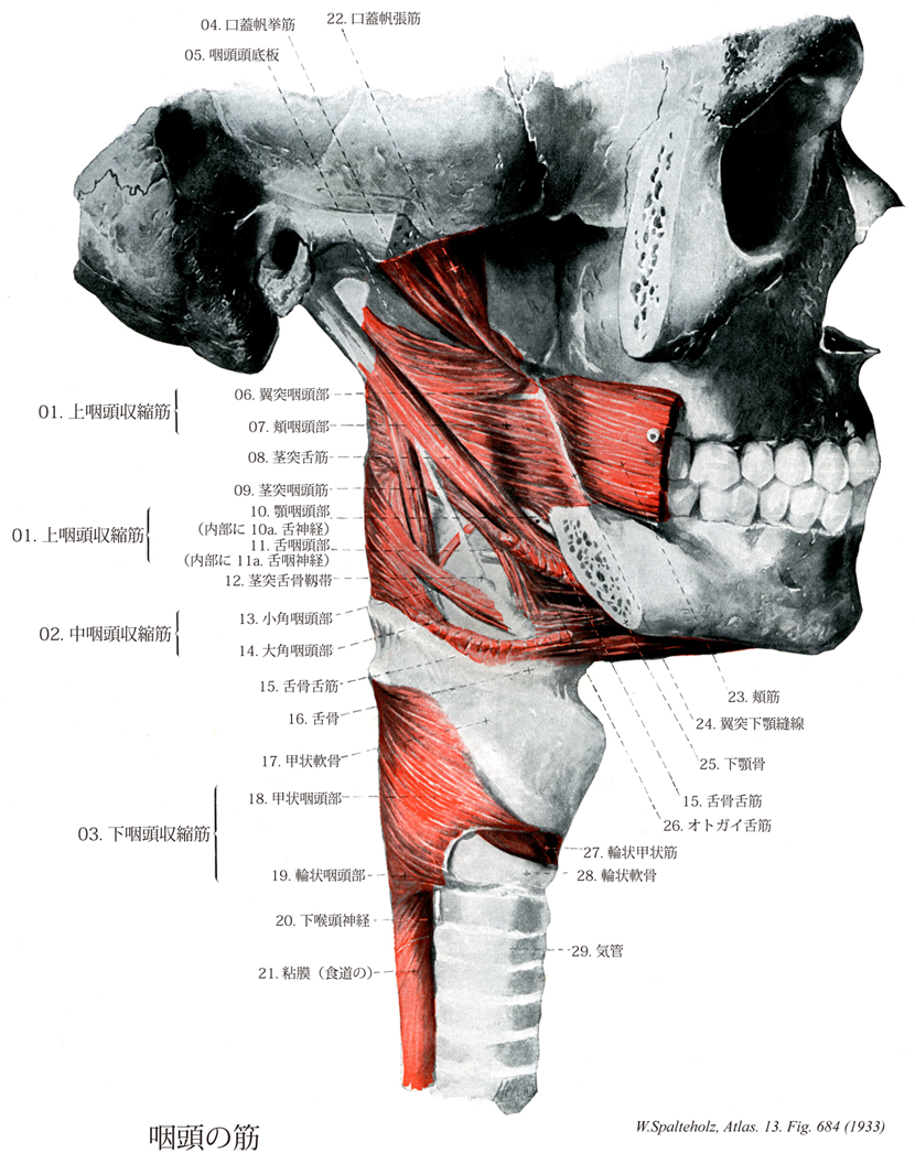 →(下咽頭収縮筋は線維の走行がもっとも急勾配な筋で、背側で中咽頭収縮筋をおおう。甲状咽頭部は甲状軟骨の外側面から、輪状咽頭部は輪状軟骨の外側面から起こり、非恒常的な線維束が第2気管軟骨から起こることがある。)