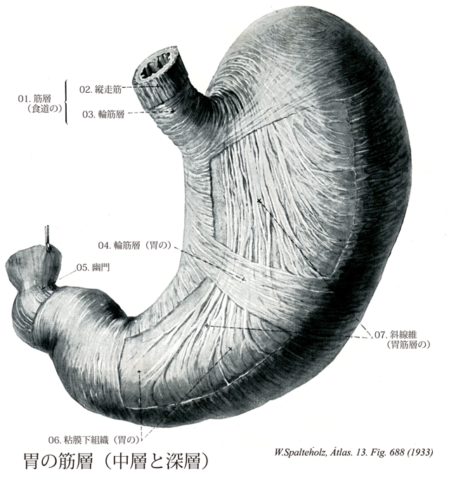 688_00【Stomach胃 Gaster; Ventriculus】 Organ extending from the end of the esophagus to the pylorus. →(胃は食道と十二指腸の間にある不規則な洋梨状の消化管。胃液を分泌し食物を糜汁とする。容量は日本人の胃の平均は♂1407.5ml、♀1270.5ml。形状は死体ではウシの角状の嚢であることが多いが、生体では内容の充満度、体位、機能状態によって著しく変化する。位置は上端は左第5肋間、下端は内容の空虚なとき臍より三横指上方。胃の大部分は左下肋部と上胃部に位置する。部域は①噴門十二指腸が胃に連続する部。その内腔は狭く噴門口をなす。その①は、正中線よりわずか左側で、第7肋軟骨が胸骨に付着する高さにある。前腹壁より約10cm深部で、切歯から食道を経て40cmで達する。②幽門(幽門口)胃と十二指腸の境界。壁内に輪状に走行する幽門括約筋が発達しているため壁は輪状の高まりとなって幽門孔をとり囲む。その位置は、第1腰椎の下端の高さ正中線の約1.5cm右方である。③幽門部胃体と幽門部の間に介在する比較的細い部。その胃体側を幽門洞、幽門へつづく管状部を幽門管とよんでいる。④胃体噴門と幽門部との間で胃のもっと広い部域。胃体管は胃の小弯に沿って生じるとされる十二指腸への通路。胃体の上端部で行き詰まりの嚢状の部分を胃底といい横隔膜の直下に位置する。胃底が噴門へつづく面と食道下端は鋭角状の噴門切痕をつくる。このほか胃の前壁と後壁を区別しこの量壁が上縁と下縁で互いに移行する弓状の縁をそれぞれに小弯と大弯といい、小綱と大網の付着線をなしている。胃体と幽門部の境目の小弯は内方へ深く落ち込み角切痕(胃角)をつくる。胃壁の構造は外表は腹膜の一部である漿膜でおおわれ小綱および大網表層へ移行している。平滑筋からなる筋層は外層が縦走筋(外縦筋)、中層は最もよく発達し、輪走筋(中輪筋)、食道の内層筋から発して胃体を斜走するが、胃底では輪走する。幽門部では中輪筋がとくに発達し幽門括約筋となるが、内斜筋は欠いている。胃の内面は胃の粘膜でおおわれ、収縮時には多数の縦走するヒダ(胃粘膜ヒダ)がみられる。粘膜の表面には小さい陥凹が多数みられ(胃小窩)、その底部に固有胃腺が数個ずつ開口する。胃粘膜は浅い溝によって直径約2~3mmの多角形に区画されている。これを胃小区という。固有胃腺を構成する細胞は主細胞、傍細胞、副細胞がある。幽門腺は幽門部にある分枝単一管状胞状腺である。)