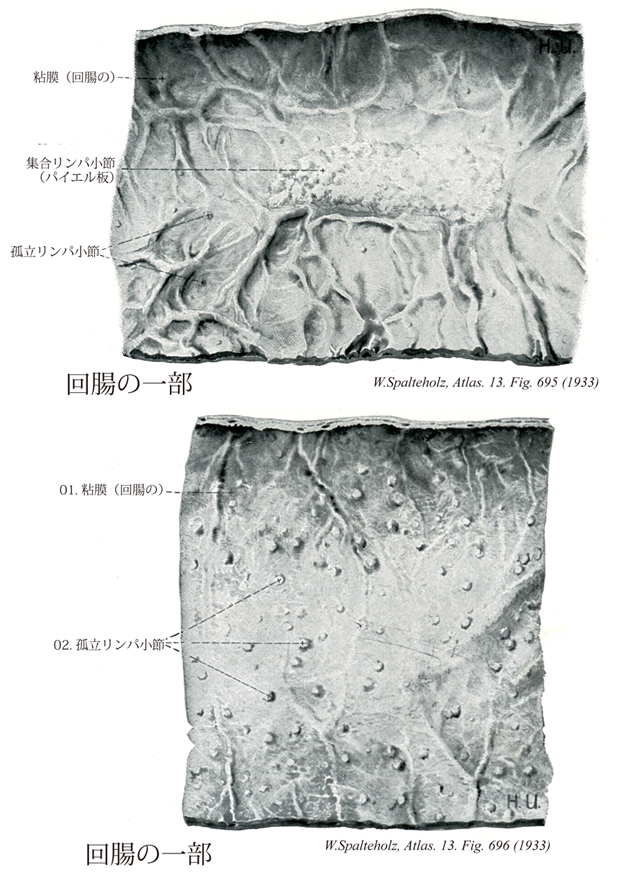 696_00【Ileum回腸 Ileum; Intestinum ileum】 Terminal segment of the small intestine, about 3.5 m long. →(回腸は腸間膜小腸の肛門側の5分の3で、空腸との境界は明確ではない。直径約2.5cmの可動性の管で、回盲弁を介して大腸の始まりの部分出る盲腸に続く。回盲弁は回腸から盲腸への内容物の流れを調節している。空腸に比してやや白色味を帯びる。回盲部から約60cmの口腔側に高さ約5cmの円錐状ないし円筒状の突出物が2%の頻度でみわれる。これは、胎生期における卵黄管の遺残物でメッケル回腸憩室という。腸絨毛は空腸に四角して少なく2500個/cm2で回腸の吸収上皮の表面積は5.3m2である。回腸には20~30個の集合リンパ小節がある。これをパイエル板といい、その表面には絨毛を欠く。)