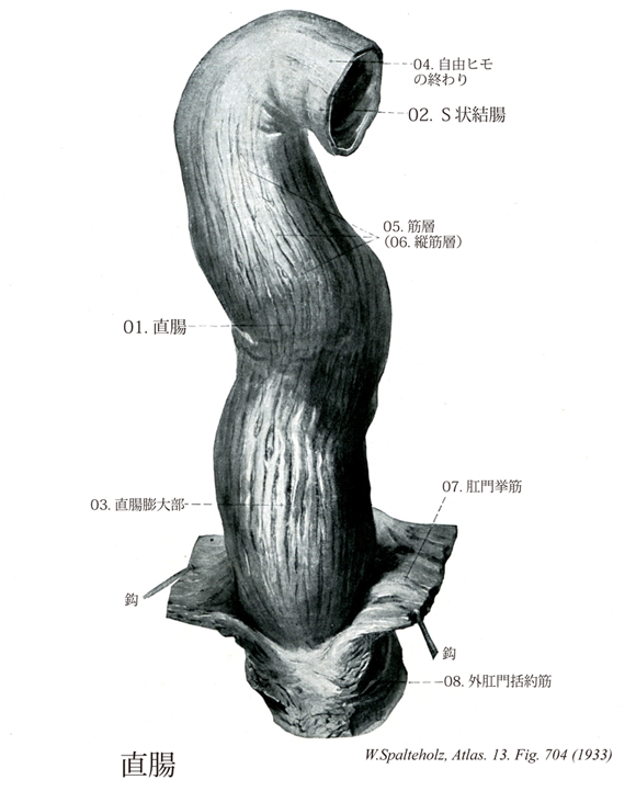 704_01【Rectum直腸 Rectum; Intestinum rectum】 Tenia-free 15 cm long segment extending between the sigmoid colon and anus. →(直腸は消化管の末端部でS状結腸につづく大腸の一部である。結腸から直腸への移行はゆるやかで、仙骨中央部あたりがほぼ両者の境界となる。直腸は腸間膜を欠き、直腸ヒモを示さない部分である。直腸の下端は、骨盤隔膜を貫く寸前までで、それ以下は肛門管である。肛門管の直上部にあたる直腸窩部はふくらみ、ここを直腸膨大部という。膨大部上方には横走するヒダが2~3本認められ、直腸横ヒダといい、最も恒常的なものは右壁にあって、コールラウシュのヒダという。直腸ははじめ仙骨の曲がりに沿って前方に凹の間借りを示し、これを仙骨曲といい、下端近くでは前方に凸の曲がりを示し、これを会陰曲という。直腸壁の平滑筋の筋層のうち、重筋層と一部の輪筋層は周辺の臓器へとのび、直腸尾骨筋、直腸膀胱筋、直腸尿道筋などとよばれる筋束をなす。直腸が内容をいれて拡張すると、壁の伸展刺激は求心性神経線維によって仙髄に伝えられ、反射的に内容の排出、すなわち排便が起こる。このような排便中枢の中枢は仙髄(S2~4)にあり、肛門脊髄中枢anospinal centerといわれる。排便defecationのさいには、交感神経が抑制されるとともに、副交感神経の興奮が高まって、大腸の蠕動・収縮がおこり、内肛門括約筋は弛緩し、さらに陰部神経を介して外肛門括約筋も随意的に緩められる。そのほかに、腹壁の筋・横隔膜・骨盤隔膜を作る肛門挙筋の収縮によって腹圧が高められ排便を助ける。)