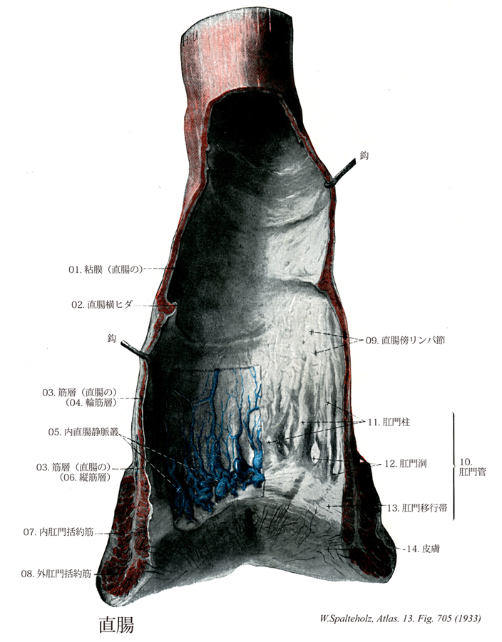 →(直腸の筋層は内輪筋層は、移行部付近で最も肥厚し、内肛門括約筋を形成して終わっている。外縦筋層は、徐々に、肛門挙筋(縦走する骨格筋)に置き換えられていき、やがて結合組織中に終わる。また、内肛門括約筋の外側には、輪走する横紋筋があり、これを外肛門括約筋とよぶ。)