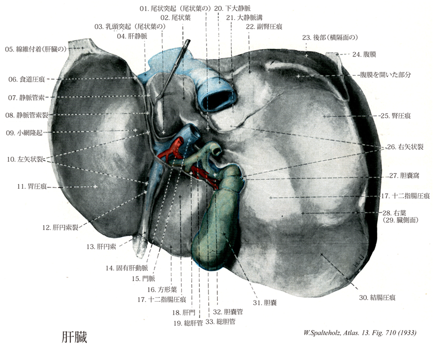 →(肝臓の臓側面は後下面で、いろいろの臓器に接するので、それに応じて浅い凹み(圧痕)がみられる。左側、すなわち左葉の下面には胃による胃圧痕、食道による食道圧痕がある。右側(右葉の下面)には、十二指腸・右結腸曲・右腎臓・副腎に接する十二指腸圧痕・結腸圧痕・腎圧痕・副腎圧痕がある。臓側面の中葉、すなわち右葉の左端部には、H状の溝がある。Hの横棒にあたる凹みは肝門で、肝臓に出入りする脈管(肝動脈・門脈・リンパ管)・神経・肝管が通るところである。Hの左脚にあたる縦溝は左葉と右葉との境界になる深い矢状裂で、前部は肝円索裂といわれ肝円索をいれ、後部は静脈間索裂で静脈間索をいれる。Hの右脚にあたる縦溝は浅い凹みで、前部は胆嚢窩で胆嚢をいれ、後部は下大静脈をいれる大静脈溝である。H状の溝で囲まれ、肝門の前方にある長方形の部は方形葉といわれ、胃の幽門と十二指腸の始部とに接する。肝門の後方にある部は小さく不規則形で、尾状葉といわれ、横隔膜・網嚢の上部に面する。尾状葉は前方に乳頭突起を出し、右前方には尾状突起を出して右葉に連なる。尾状葉は尾のような尾状突起をもつので、そのように名づけられた。)